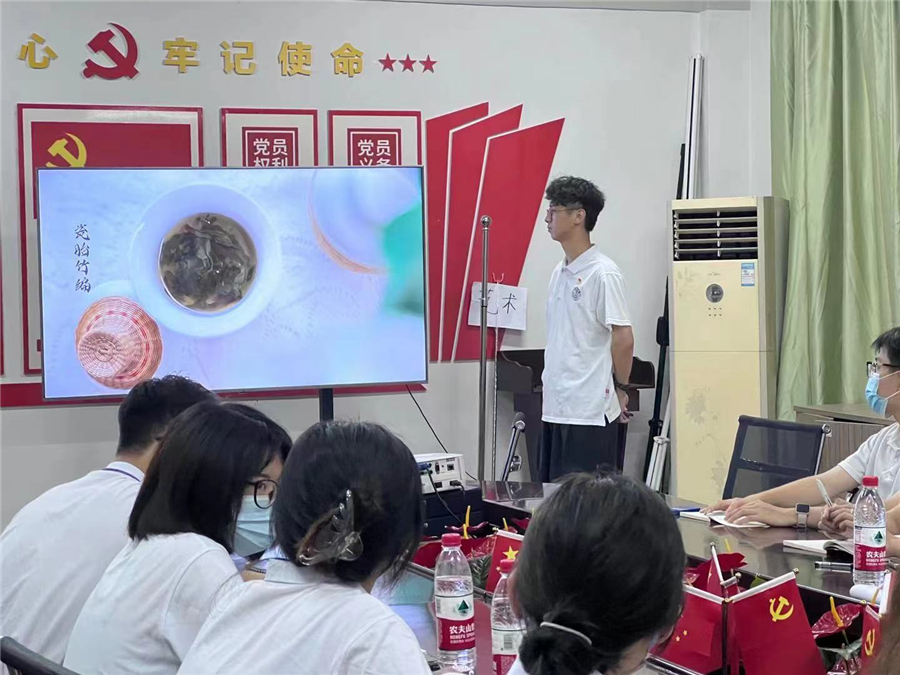 紧接着,陈金伟开展了“文化成就未来,非遗不容忘怀”主题党日活动学习。通过分享我国非物质文化遗产,以及以习近平同志为核心的党中央高度重视非遗保护传承工作的相关事迹,带领大家走进非遗。陈金伟结合自身暑假三下乡红色文化调研经历说道,非遗是中华民族智慧和文明的结晶,是先辈留给我们的宝贵财富,更是中华优秀传统文化的重要组成部分。他呼吁大家非遗需要青年助力,青年也需要非遗文化滋养,当代青年应该用知识点亮未来,不断传承、弘扬中华优秀传统文化,树立文化自信,坚定爱国主义信念。