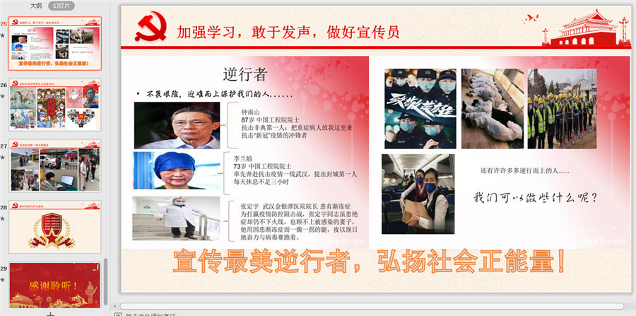 关树基围绕建党以来不同年代的共产党员如何讲担当,抗击新冠病毒疫情期间共产党员和“最美逆行者”如何重担当剖析共产党人的坦荡胸襟和无私奉献。他动静结合、声情并茂、慷慨激昂,图文并举的分享董存瑞、雷锋、焦裕禄、钟南山、李兰娟等共产党人的感人事迹和担当精神。同时他还表扬了我院学生党员和入党积极分子李锐、李敬邦等积极投身社区联防联控的担当。重申担当精神从何而来,强调勇于担当是一种境界、一种胆识、一种修养。