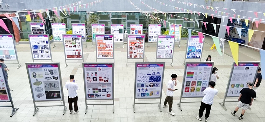 本次展览是《企业形象设计》课程教师团队的一次实践成果汇报,该团队一直以来以立德树人为育人教学目标,坚持思政内容进课堂。采取思想政治教育与艺术教育结合的教学原则,明确课程思政教学目标,挖掘教学内容,设计教学环节,确立科学的“课程思政”效果评价体系。混合式教学方法,灵活运用信息化技术辅助教学。课前预习、课中教学、课后延伸的“三课”并进方式与信息化技术辅助教学相结合,促进教学质量提升。成果转化与思想道德评价并进。成果转化包含命题竞赛成果与企业采用成果,加入思想道德评价,与社会市场需求接轨,致力于服务企业、服务地方。