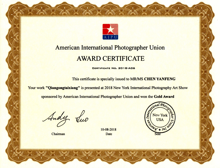 近日,美国国际摄影师联盟(American International Photographer Union,简称AIPU)主办的2018纽约国际摄影艺术展暨2018纽约国际摄影大赛,在纽约市皇后区法拉盛市政厅展览馆举行。本次展览暨比赛收到了全球各地关于商业、纪实、艺术三个类别的5000多幅作品,广州商学院太阳成集团tyc33455教师陈雁峰的作品《千功泰祥》荣获了2018纽约国际摄影艺术展金奖。