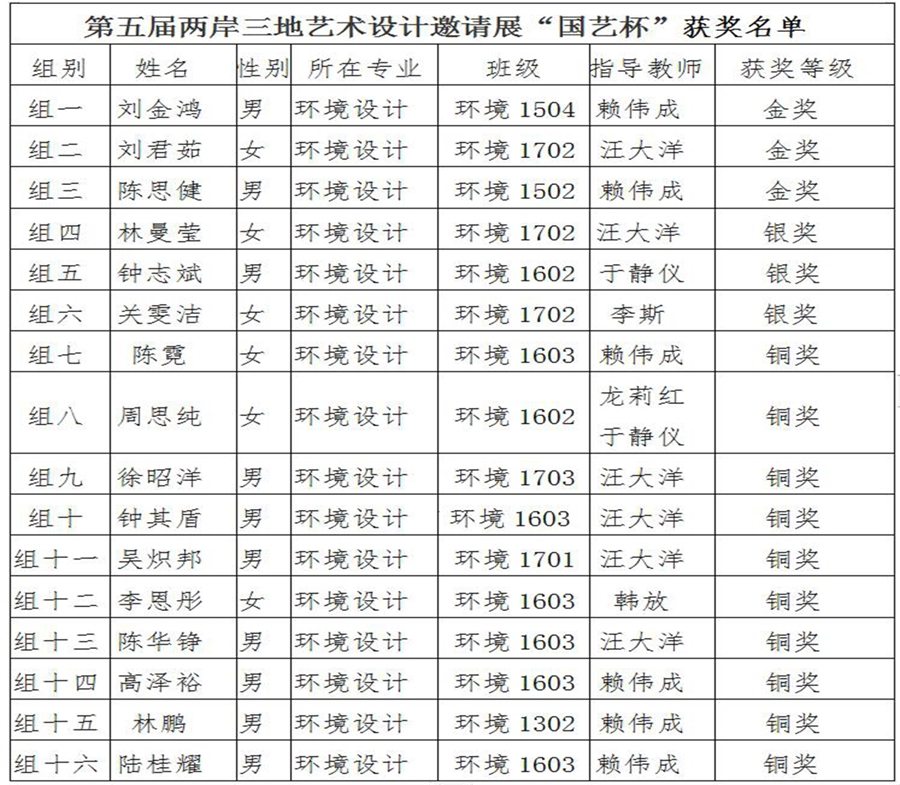 近日,在由环亚国际设计师协会(ADA)主办,国艺杯两岸艺术设计邀请展组委会承办的“国艺杯”两岸三地艺术设计邀请展中,我校太阳成集团tyc33455环境设计师生荣获22个奖项:教师组金奖3项、学生组金奖3项、学生组银奖3项、学生组铜奖10项、大赛优秀指导老师3项。