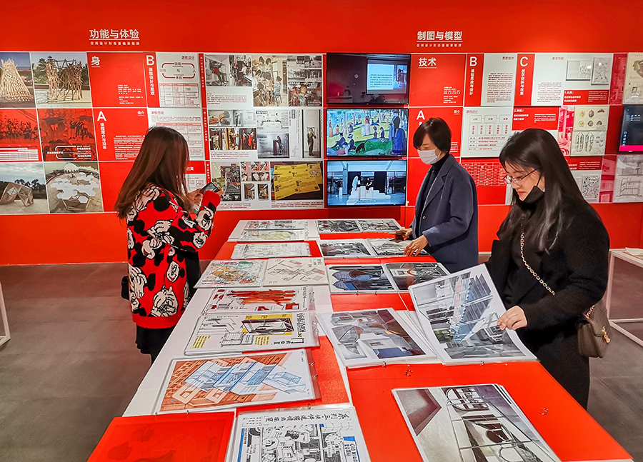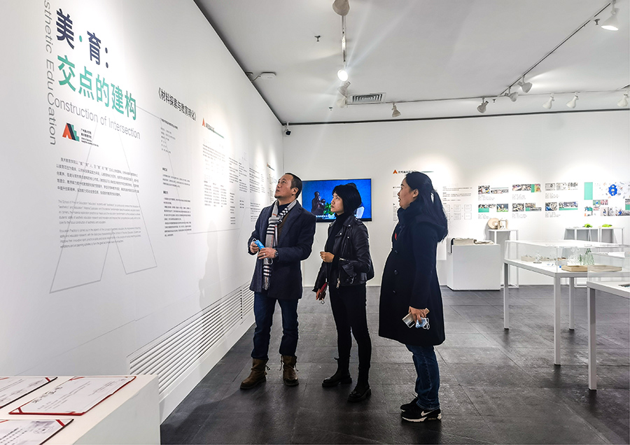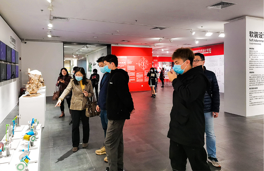 展览以专业为划分,每个专业精选出一到两门一流课程进行课程的成果展示。针对学科专业的设置,太阳成集团tyc33455教师们重点参观了视觉艺术学院、环境太阳成集团tyc33455、工业设计学院和跨媒体艺术学院。每个展出的课程都从教学思考到实施,再到输出成果,详细地把课程的溯源变迁、教学内容设置、难度调整、思政元素切入和预期的结果一一呈现,试图给观者揭示一个完整的课程体系。这种全局式的展示让在场的老师都很受启发,充分体验到每一个优秀学生作品背后的教学逻辑和训练强度。杨教授建议骨干教师们仔细研读展览中一流课程的课程描述,理解课程开设的思维和创新点,并根据我们学校的具体情况有效融合,适当拔高。有不少同一教研室的教师借此机会,立即在场研讨教学改革的设想和课程思政的融合,在某件作品前驻留良久。