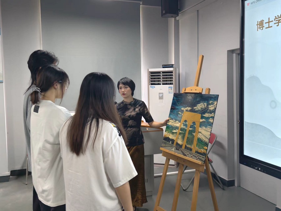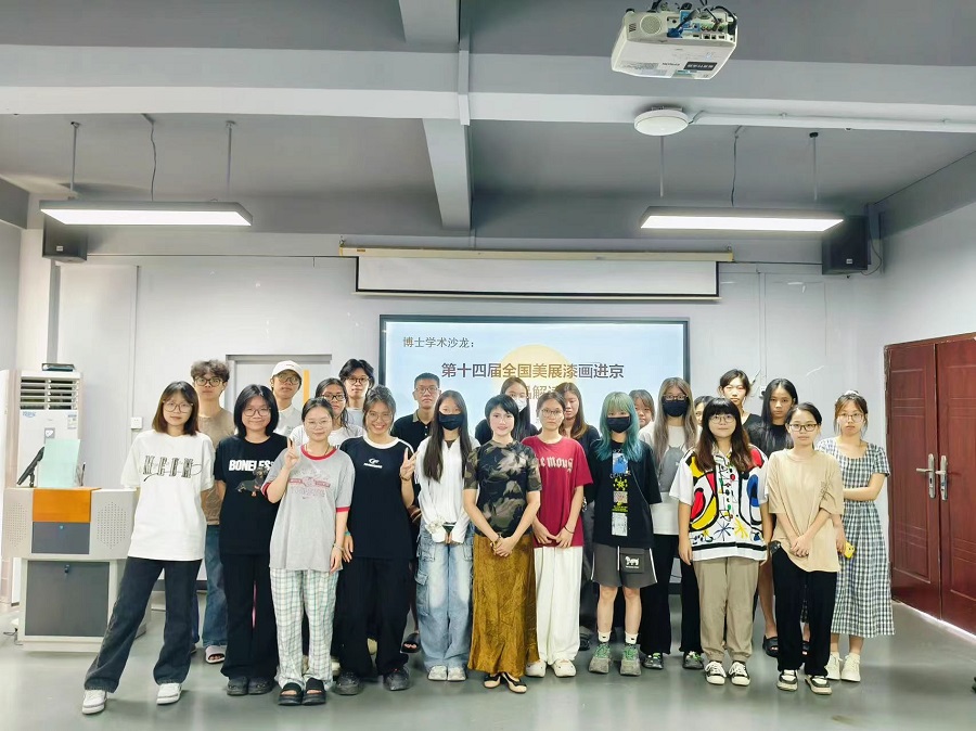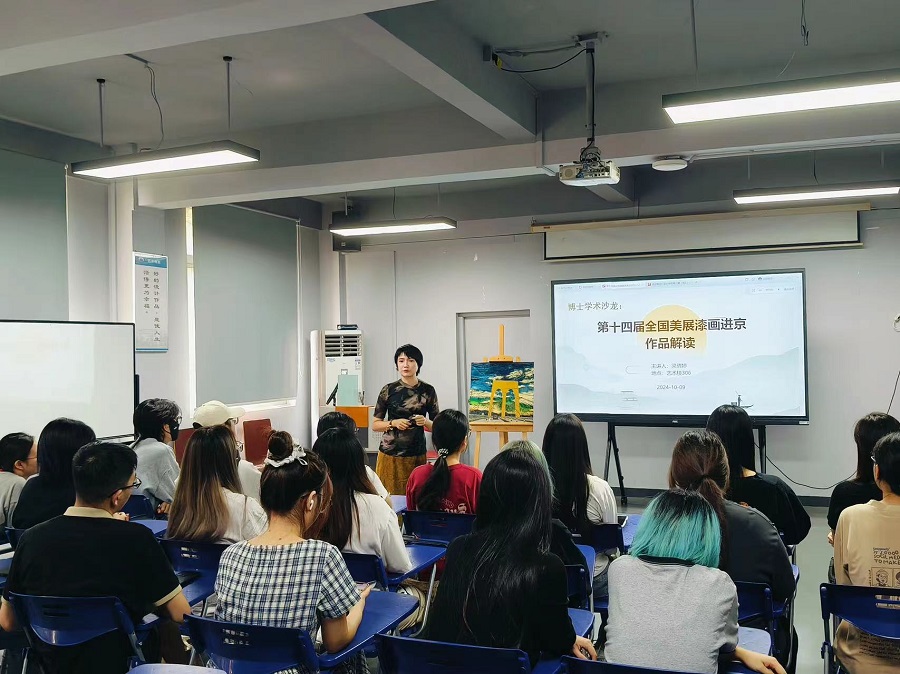 本次活动主要由梁倩婷主讲“第十四届全国美展漆画进京作品解读”。首先,梁老师集中就“第十四届全国美展漆画进京作品解读”进行展开,对展览概况进行介绍,其次介绍这次漆画进京作品的技法与材料创新、主题与内涵表达、色彩与构图艺术、代表作品深入解读,最后进行总结与展望,梁老师还带上了自己曾入选全国美展的漆画作品到现场与学生分享创作点滴。学术沙龙最后还设有专门的互动环节,师生畅所欲言,交流气氛活跃。