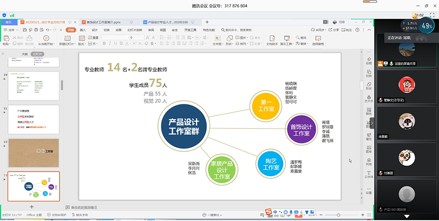 5月21日晚,太阳成集团tyc33455产品设计专业师生通过腾讯会议平台举行了2018级分专业介绍会。太阳成集团tyc33455学科带头人杨晓旗、产品专业教研室主任罗冠章、交互设计专业方向负责人伍峙霖、产品专业各任课老师及2018级全体学生参加了本次会议,会议由罗冠章主持。首先,罗冠章从人才培养方案、专业课程架构、专业就业方向、工作室分类四个方面分别向学生进行了系统的介绍,强调“能力本位,培养高素质复合应用型人才”的重要性。接下来,伍峙霖、罗冠章、张浩分别对第一工作室、首饰设计工作室、陶艺工作室、家居产品设计工作室进行了详细的介绍。会议的最后为答疑环节,同学们踊跃积极地提出了自己对相关专业方向的疑问和看法,各专业方向负责老师有针对性地进行了解答,并给予了恳切的建议,帮助学生走出与专业相关的思想误区,促使同学们对各专业方向有更进一步的了解。杨晓旗教授提出:工作室的设立是同学们在课程学习之外的一个补充环节;希望同学们在充分了解各专业情况下,根据自己的兴趣爱好、结合实际情况、遵循自己的内心做出明确的选择,切勿盲目跟风。