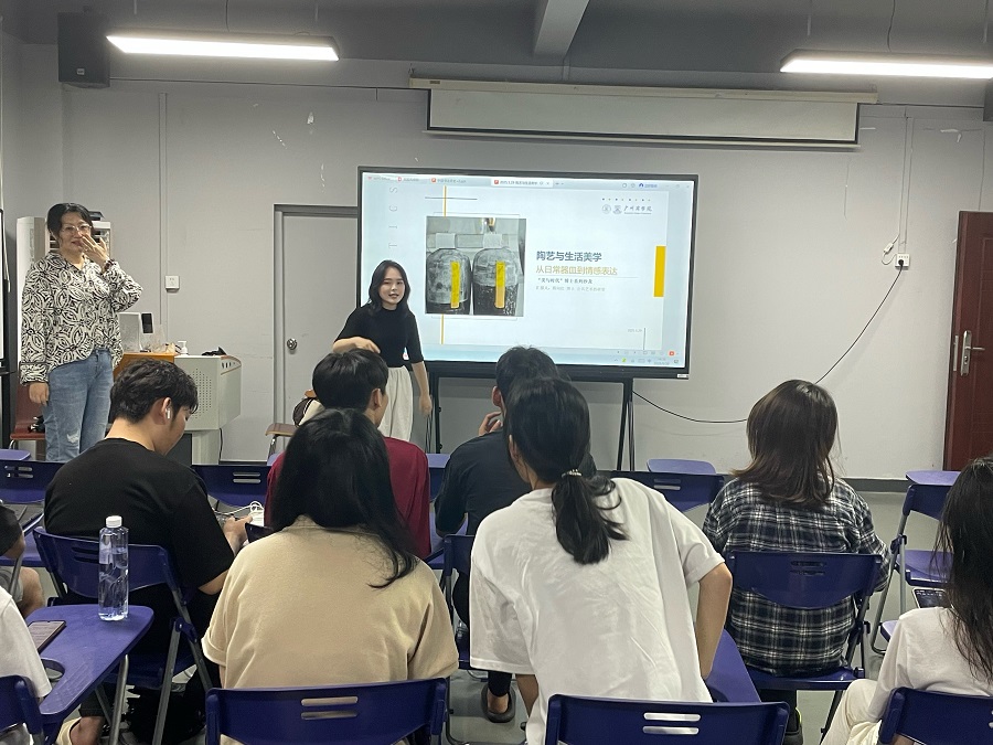 首先,蔡向红围绕陶艺与生活美学的主题展开,重点就陶艺作为美学的媒介、陶艺的实用与审美的时空对话等方面展开叙述;随后通过具体的经典案例,图文并茂地解析了陶瓷材料叙事性、陶艺创作疗愈实验、装置情感场域;最后,与同学们围绕着陶艺与生活美学共同探讨陶瓷作为材料,从日常器皿到情感表达上有什么特殊性以及如何运用到日常生活中。在讨论环节,同学们积极发言,现场氛围活跃。