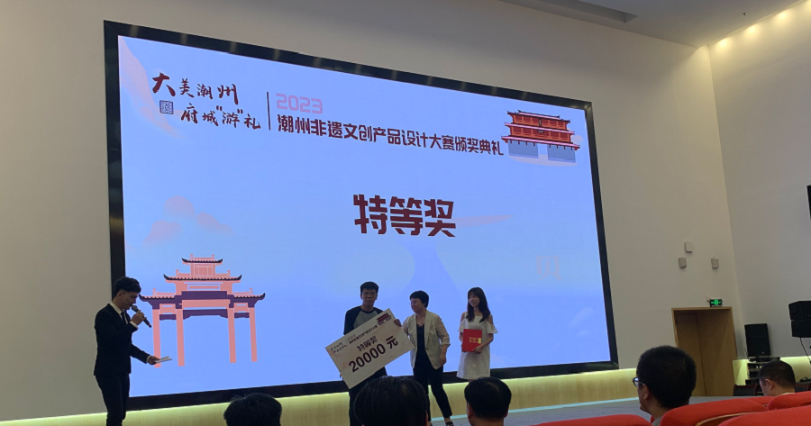 近日,大美潮州府城“游”礼 2023年潮州非遗文创产品设计大赛评奖结果揭晓,太阳成集团tyc33455家居设计工作室成员陈心妍、林烨组成队伍参赛,斩获大赛唯一一个“特等奖”荣誉,赢得20000元现金奖励。