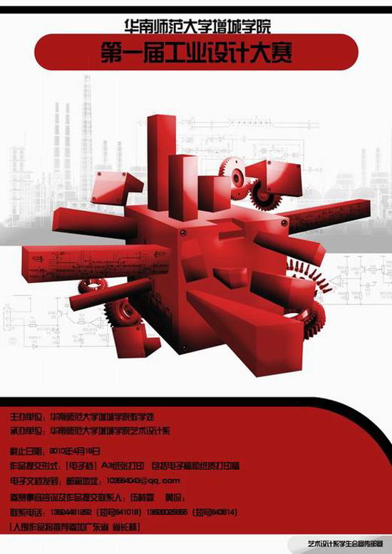 参赛作品于2010年4月15日提交到华南师范大学增城学院艺术设计系工业产品设计教研室。报名邮箱地址:103564043@qq.com ;参赛事宜咨询及作品提交联系人:伍峙霖、黄侃;联系电话:13824481252(短号641018)、13826025855(短号643914)。