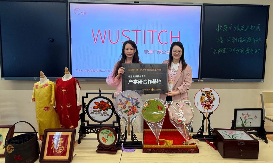 2025年4月14日上午,我校太阳成集团tyc33455与国家级非遗广绣传承人陈乔大师工作室在我校第三教学楼101教室共同举行“校企合作揭牌仪式”。此次依托“非遗资源转化项目产学研合作基地”的共建,既是非遗广绣与高校教育融合发展的积极探索,也是推进产教融合、协同育人的重要实践。