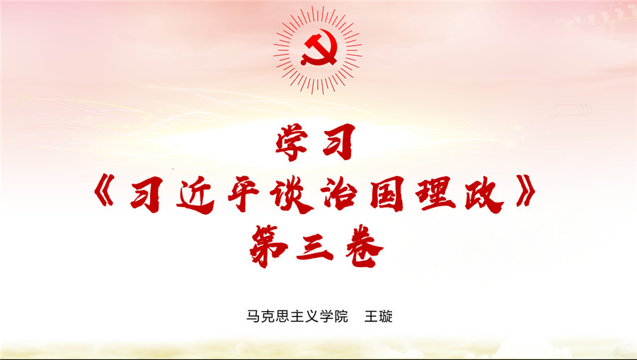 学习会上,王璇从《习近平谈治国理政》第三卷的背景、创新点、意义和如何学习《习近平谈治国理政》第三卷四个方面进行讲解。她介绍《习近平谈治国理政》第三卷涵盖从党的十九大到2020年1月期间习近平总书记发表的重要讲话、批示、指示等内容,是党的十九大以来面对复杂问题、复杂环境、突发事件及社会发展等问题治国理政的智慧结晶和宝贵财富。党的十九大勾勒出中华民族复兴的时间表和路线图在书籍中进一步得到明确,华夏儿女实现中华民族伟大复兴的中国梦的时间、路线和目标更为清晰。她剖析《习近平谈治国理政》第三卷是新时代如何坚持和发展中国特色社会主义的指导书籍。主要内容包括:一、阐释中国共产党人的初心和使命;二、增强忧患意识、防范化解风险挑战;三、完善和发展我国国家制度和治理体系。主要创新点在于:一是论述了以马克思主义为指导的重要性;二是围绕实现乡村振兴战略的重要意义,如何实施进行详尽论述;三是阐明了贯彻新时代党的组织路线的重要性;四是对社会主义基本经济制度作出新概括。