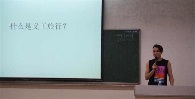 “什么是义工旅行” ,在同学们的疑惑声中,陈晖首先从义工旅行的定义开始为大家回顾他从想这么做到付诸实践的整个过程,他多次强调:义工不是穷游,而是切切实实地体验生活,在体验中收获生活的感悟。陈晖着重强调了“责任”二字,并与同学们探讨应该抱什么样的心态去参加整个旅行,在义工过程中,需要做好自觉开展工作的心理准备,并且事先要和义工老板沟通好所有工作,陈晖同时还提到,在义工旅行的过程会出现有很大的心理落差,与自身的期望值相差甚远,特别是在旅游旺季,义工并没有太多时间留给自己旅行,更别说有完整的时间可供使用,甚至连休息的时间也不能保证。因此,陈晖再次为同学清晰了“义工旅行”概念:义工旅行,先是义工,而后才是旅行,调整心态,乐观面对,无论是义工还是旅行,认真付出,定能有所收获。最后,陈晖同学向同学们分享了参与义工旅行的途径,并解答了同学们对义工旅行的相关问题,鼓励大家不妨选择一次有意义的义工旅行,在行程中,我们可以不断调整,不断收获。