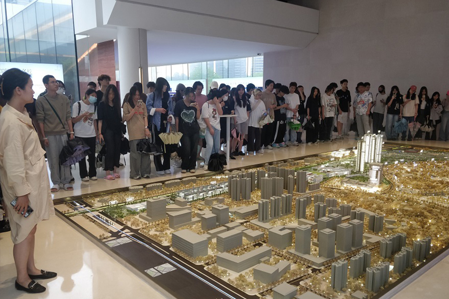 调研首站,师生一行抵达华润置地长隆万博悦府项目售楼部。项目负责人王创彬经理从“城市核心区迭代”视角出发,介绍了项目区位及规划亮点,强调万博CBD南拓首站的TOD模式,通过商务、生态与居住功能的串联,打造全龄友好型社区。随后,师生实地参观了项目样板房及景观示范区,重点了解地域性植物配置、材料细部处理与沉浸式空间体验的设计策略,深入感受项目在细节与整体空间营造上的综合水平。