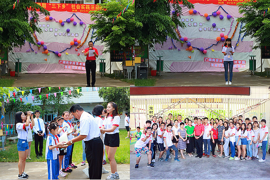 活动的第一部分,对艺希之晨筑梦服务队在登畲村进行为期十天的“三下乡”社会实践活动做总结和表彰。首先,龙村镇第三小学温东保校长、服务队指导老师代表钟金发老师、服务队学生代表黄柳艳同学和龙村镇第三小学学生代表温佳佳同学依次进行总结发言;其中,温东保校长对服务队的热情及奉献精神十分赞赏,对服务队全体队员的辛勤付出和显著的效果给予充分地肯定并表示感谢。然后,为在教学比赛中获奖的学生和优秀学员进行颁奖,以及龙村镇第三小学温东保校长和服务队代表钟金发老师互赠锦旗。
