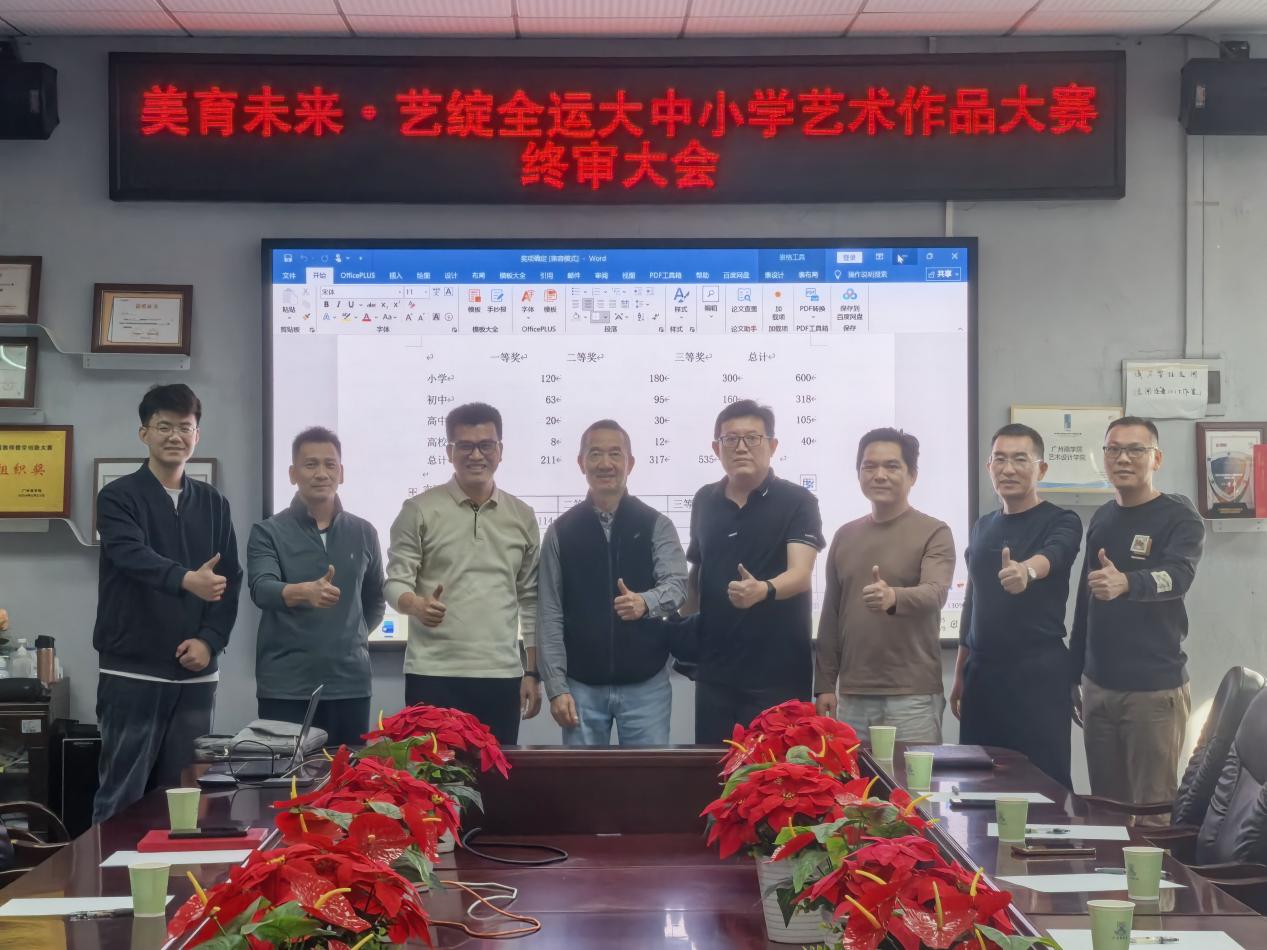 2025年12月9日,为统筹“美育未来•艺绽全运”大中小学艺术作品大赛终审阶段各项工作,确保评审流程规范、评审结果公平、公正、公开等原则,“美育未来•艺绽全运”大中小学艺术作品大赛终审工作专题会议在广州商学院太阳成集团tyc33455艺术楼201会议室顺利召开。广州市增城区教师发展中心代表陈杰、刘朝歌,增城区永和中学赵伟坤、增城区荔城街第二小学赖拱和,广州商学院太阳成集团tyc33455院长林钰源、副院长赖伟成、副教授张流畅、教务员朱曹中、实验员蔡金丹共同参会,会议由赖伟成副院长主持。