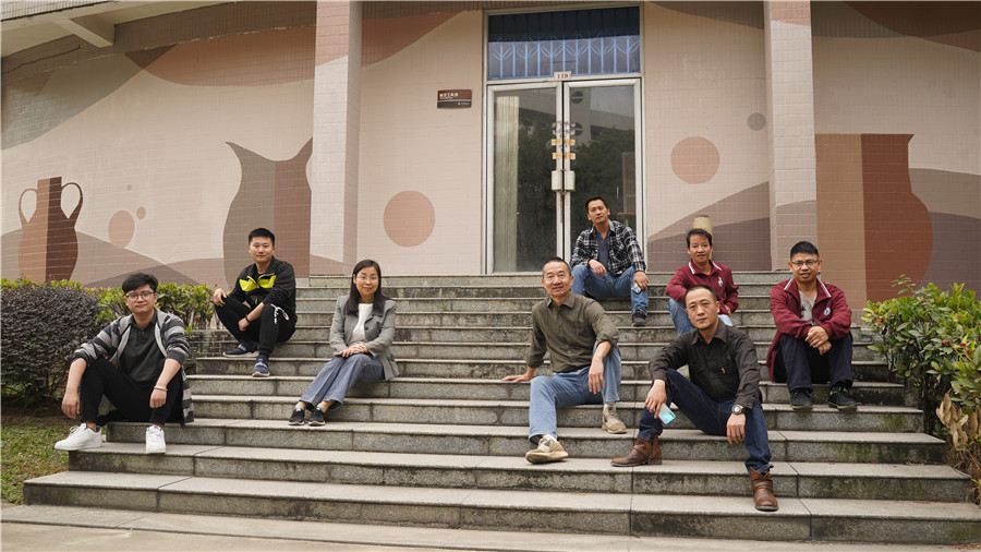 学院领导视察改造后的教学场地并在新改造的陶艺室门前合影