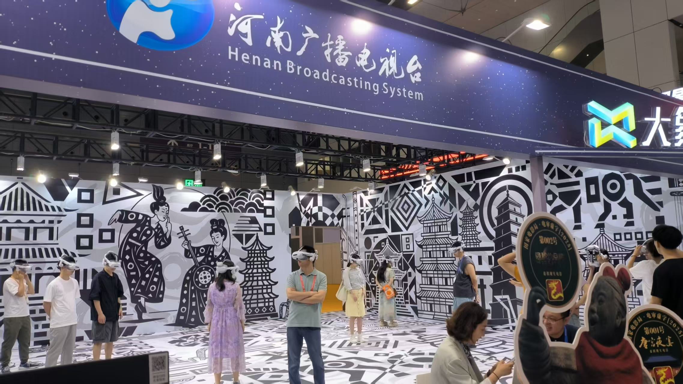 在14号影视·版权·游戏电竞展馆,重点展示实施文化数字化战略、媒体融合发展战略、科技赋能新闻出版业,以及互联网游戏和电子竞技等取得的创新成果和新产品、新技术,展示AI、元宇宙在文化产业领域的应用和最新趋势,并设立广电视听展区、电影工业展区、新闻出版展区、版权交易展区、游戏电竞展区、潮玩文化展区。团队深入了解了AI绘画工具、数字人直播技术及元宇宙场景开发的最新成果。并在河南广播电视台展馆现场体验“XR唐宫夜宴”项目,该项目展品是获得了中国虚拟现实电影第001号和002号“龙标”的作品《秦宫夜宴》和《隐秘的秦岭》,观众带上VR头显设备后,不仅能360°围观唐朝乐舞俑“蹦迪”,还能“触摸”千年文物。