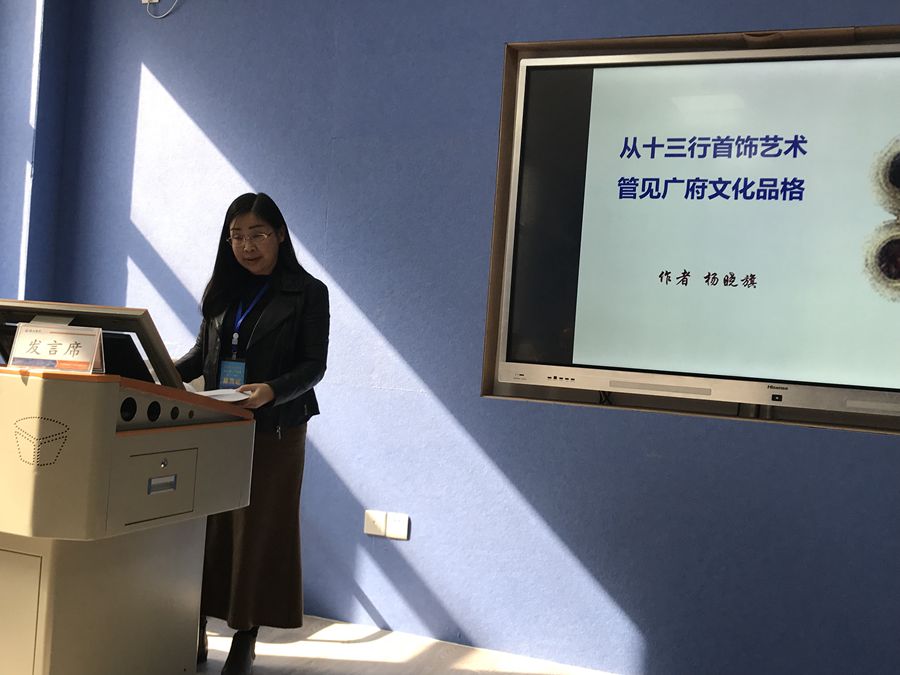 杨晓旗作为广府文化研究基地特聘研究员,连续多年投稿参会。在本届论坛中,担任第三组第一场主持人。也在论坛上发表了《从十三行首饰艺术管见广府文化品格》的论文讲演。本论文是杨晓旗主持的广州市哲社“十三五”规划课题“十三行时期广府地区首饰艺术风格流变研究”与广州商学院校级重大课题“广州十三行时期广府首饰艺术风格研究”的研究成果之一。