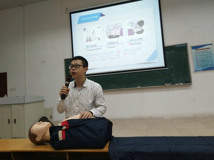 本次知识讲座分为PPT教学理论知识讲解与实际操作两部分,李斌恺医生从伤情辨别、调整体位、打开气道、判断呼吸、人工呼吸、胸外心脏按压等方面做了详细介绍,同时结合不同伤情下应采取的不同急救措施,对心肺复苏术各环节技术和流程进行了现场示范。在实际操作的互动环节,同学们积极踊跃地到人体模型前进行现场演练,李医生在一旁耐心指导,指导同学们正确完成每一个救护动作。