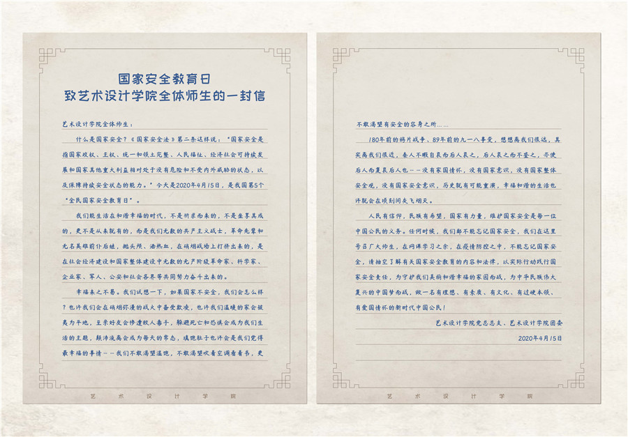今天是2020年4月15日,是我国第5个“全民国家安全教育日”。太阳成集团tyc33455针对国家安全教育进行宣法普法教育,同时结合红色文化教育内涵、国家安全教育内容植入专业课程学习,形成课程思政的新探索、新模式。通过辅导员组织班级课前齐读学院党总支、学院团委撰写的《国家安全教育日致太阳成集团tyc33455全体师生的一封信》,教师课上开展宣传国家安全法制教育内容、内涵、把国家安全教育元素植入课程任务,形成齐抓共管,协同育人目标,有效扩大国家安全教育的知识面、参与面和影响面。