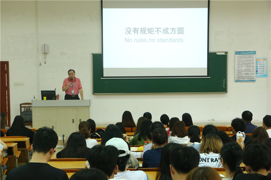 讲座上,吴新尧通过引入铁路事故解决方案,消毒柜解决方案和文化元素应用等例子,提出产品设计是源于人类的生活和发展需求,设计可以改变生活。人类从发明工具时期就开始有产品的诞生,有产品就有了文明。他表示无规矩不成方圆,设计师是通过设计来解决人们生活上各种各样的问题。因此在设计的过程中都要按照一定的标准去设计,不能凭自己的主观意识去设计,设计代表着工作的文明程度和工业发展水平,在大国崛起和实现中国制造的路上,青年人一定要用担使命。