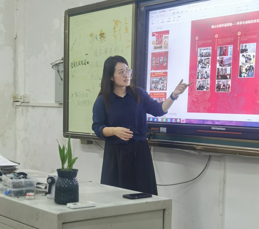 在交流会上,钟教授详细介绍了佛山年画创新研究项目组过去一年的研究历程,包括四个阶段的研究过程和成果实践。她通过展示一系列数字化研究作品,让同学们直观感受到了传统艺术与现代科技相结合的魅力。钟教授还展望了佛山木版年画的未来发展,她提出将探索虚拟现实和交互体验模式,以适应人工智能发展的趋势要求,为传统艺术的传承与创新开辟新路径。