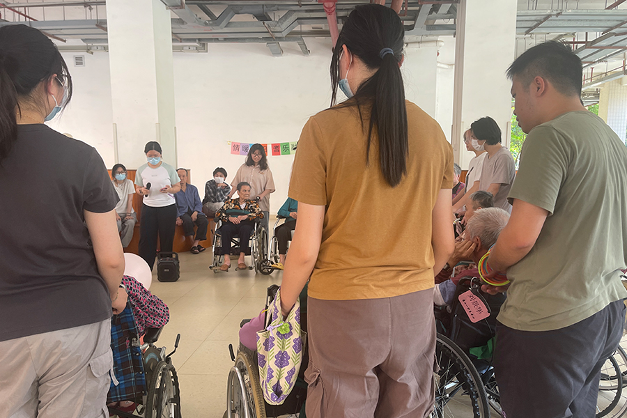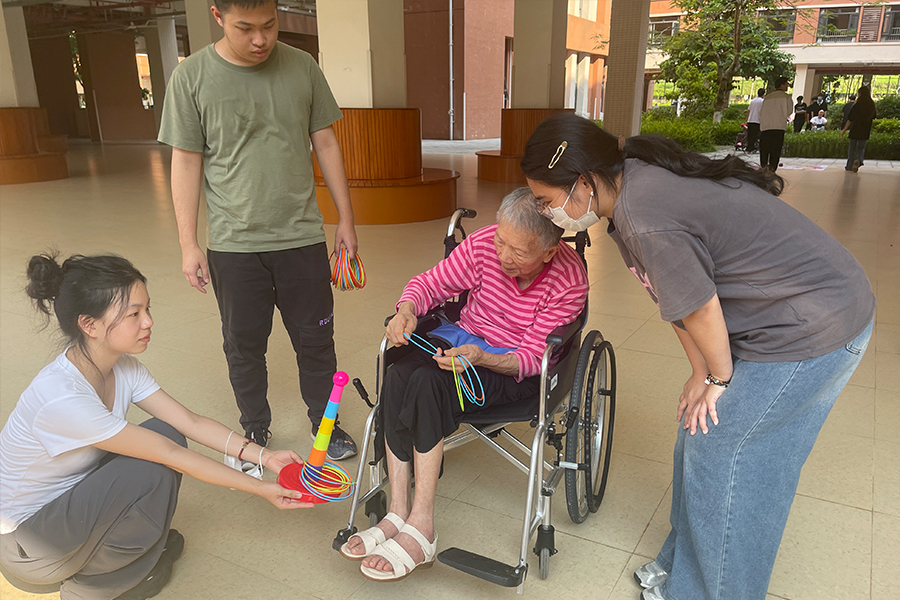 随后,师生们分组进入认知症照护区域协助老人参与活动。在护工指导下,学生们耐心沟通、规范操作,协助老人乘坐轮椅、安全下楼。在养老院架空层空间,学生们与老人共同参与“感官疗愈运动会”,现场设置的传球、丢沙包、投篮等游戏均经过适老化改良。活动过程中,学生依据课程所学,对游戏道具进行适配调整,协助老人完成参与任务,体现了良好的专业素养与人文关怀精神。