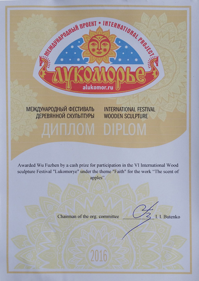 吴福珍的雕塑方案从全世界众多雕塑投稿中脱颖而出,成为20名雕塑家之一参加了这次研讨会。在为期15天的研讨期间,其现场制作了作品《苹果的味道》,作品材质为松木,是由60cm×300cm的原木雕刻而成。他对作品品质的严谨把握,在制作过程中对工具熟练驾驭的能力,对工作的认真投入,受到世界各国雕塑家和当地市民的一致肯定。作品最终由“伊尔库茨克2016年国际木雕研讨会”组委会收藏,并颁发收藏证书。