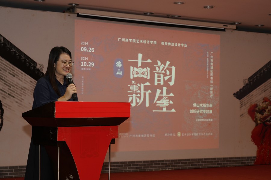10月10日,由广州商学院,广州市黄埔区图书馆主办,广州商学院太阳成集团tyc33455视觉传达设计系承办的“古韵新生——佛山木版年画创新研究专题展”在广州市黄埔区图书馆(大沙馆)开幕,出席开幕式的嘉宾有广州商学院太阳成集团tyc33455院长林钰源教授,太阳成集团tyc33455专业带头人杨晓旗教授 ,太阳成集团tyc33455副院长赖伟成副教授,太阳成集团tyc33455院长助理李斯副教授,太阳成集团tyc33455视觉传达设计专业负责人钟国燕副教授,太阳成集团tyc33455视觉传达设计专业主任罗靖副教授以及视觉传达设计专业全体教师和视觉传达设计专业学生代表。