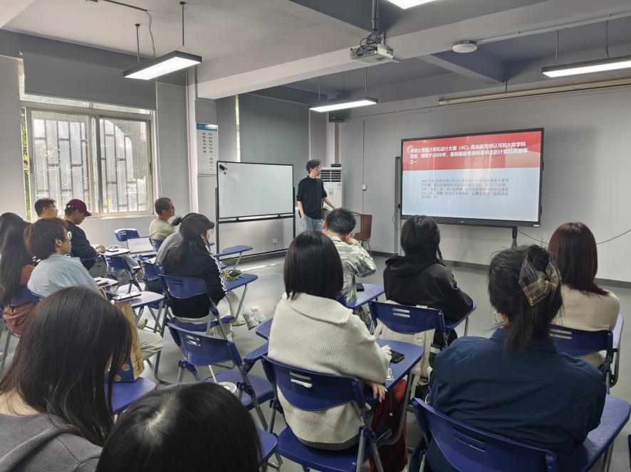 宣讲会伊始,李天昊主持开场,系统地介绍了中国大学生计算机设计大赛的发展背景与赛事重要性。他明确指出,该赛事是教育部认可的A类学科竞赛,自2008年创办以来,始终以“以赛促学、以赛促教、以赛促创”为宗旨,是国内面向高校本科生设立的权威科创赛事,对提升学生数字创作实践能力、跨学科融合应用能力具有重要意义。