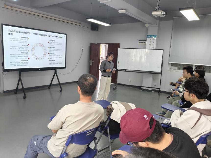 随后,王新宇围绕赛事核心内容展开细致解读。他结合官方文件,明确了校赛、省赛、国赛三级赛制的全流程时间节点,重点标注了各阶段关键截止时间与不同赛区的赛程差异,帮助师生精准把控备赛节奏;同时全面梳理了赛事11个竞赛大类的设置,重点解读了数媒相关赛道的创作要求,标注了适配本专业学生参加的赛项,明确了本年度赛事“中国古代建筑成就”的核心主题;并详细讲解了参赛组队资格、作品原创性规范、AI工具使用要求等核心标准,帮助师生规避创作与参赛过程中的常见问题。