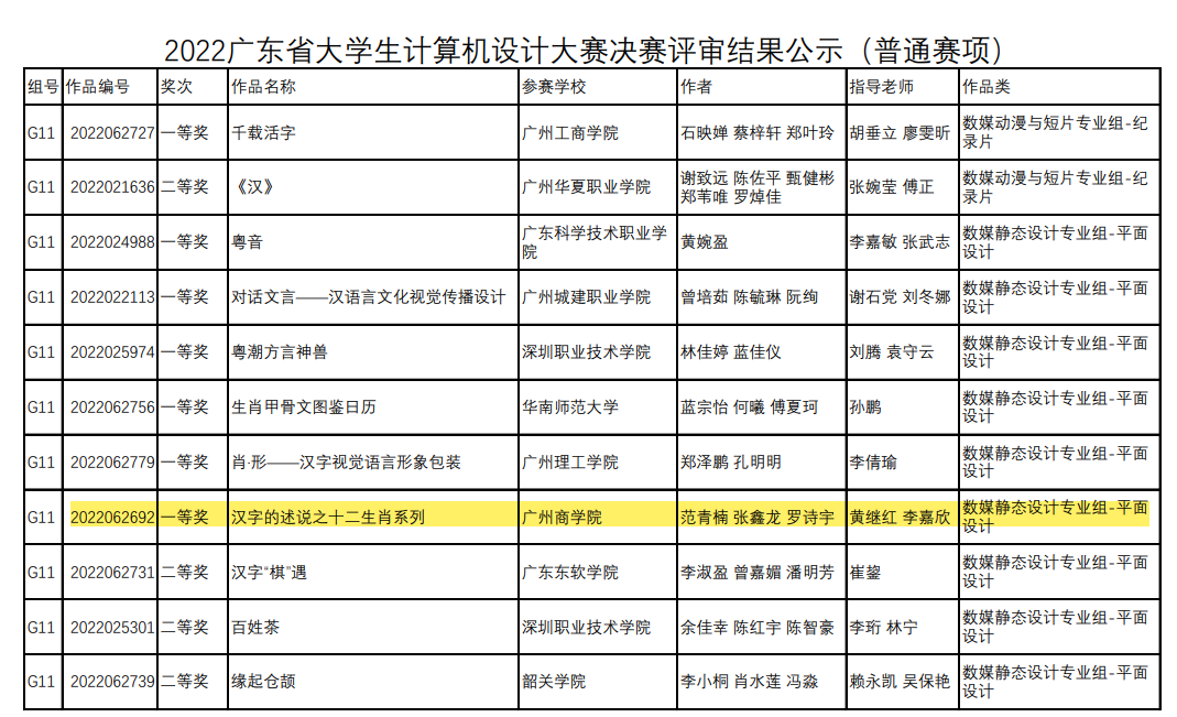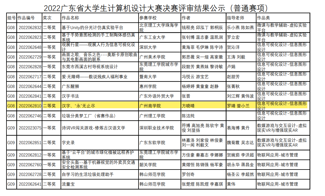 6月21日,由广东省教育厅主办,广东外语外贸大学承办的“2022广东省大学生计算机设计大赛”决赛评审结果公示,太阳成集团tyc33455获得一等奖一项,二等奖一项。
