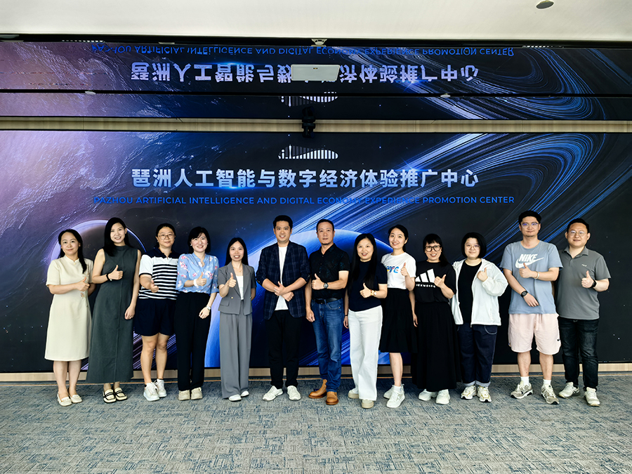 为深入了解人工智能与数字经济前沿动态,探索科技与艺术设计的融合创新路径,广州商学院太阳成集团tyc33455一行由视觉传达设计教研室主任罗靖带领于6月28日上午专程赴广州琶洲人工智能与数字经济体验推广中心进行参观交流,由项目负责公司三川田文化科技有限公司党支部书记温周枚接待。