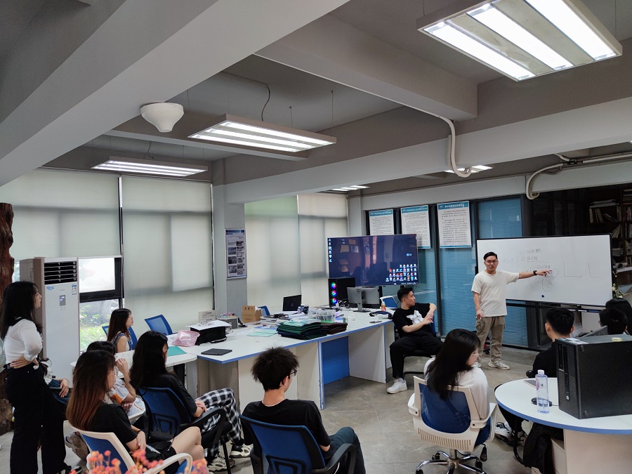 有米团队通过调研分析我校同学目前所存在的专业技术性问题,为我校环境设计工作室专门制定培训计划,涵括“需求——创意——落地”整个环节的实操性内容,进一步加强学生与相关企业公司的接轨能力。培训在5至6月之间开展,以线上线下相结合的方式进行,每周四下午为线下培训时间,设计师亲临我校101工作室教学,其他时间以录播、在线指导的方式在设计思维、设计方法、软件操作技能等项目全周期的设计内容进行全方位指导,有效提升工作室学生的实战能力。通过合作,有米团队锻炼了自身的业务能力,扩大了公司的影响力和知名度,同时提升了我校环境设计工作室学生的设计能力,实现校际联合,合作共赢。